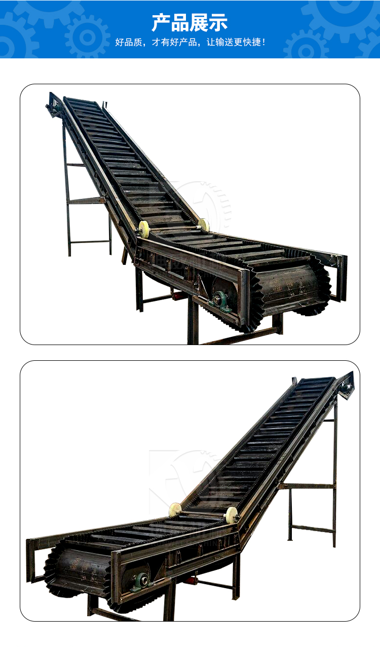 大倾角皮带输送机 依靠其特有的优势,在企业中的使用越来越普遍,在提升高度相同的情况下,所占地面和空间少,并且具有常规带式输送机的所有特点,投资成本低,因而在生产运输